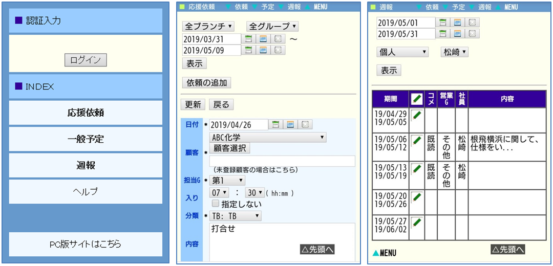 - スマートフォン版/メニュー画面・応援依頼画面・週報画面