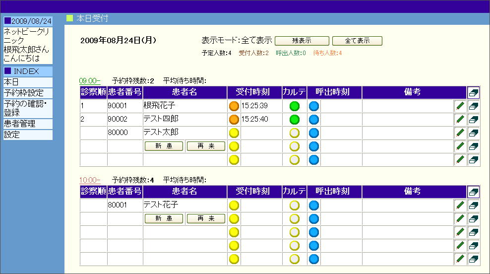 予約受付システム 外来の診療所・病院向け 診療ワクチン予約受付システムです。 管理者側のWebインタフェースはパソコン上でのブラウザを利用、ユーザ(患者)側インタフェースはスマートフォン・携帯電話のブラウザ利用を前提としますが、携帯会社のキャリアに依存せず、パソコンからも利用することができます。 新型コロナウイルスなどのワクチン接種予約受付システムについては、こちら をご確認ください。 【管理者側の本日受付画面】 詳しくは、資料をダウンロードしてご確認ください。 [ 予約受付システム資料ダウンロード (PDF形式) ]